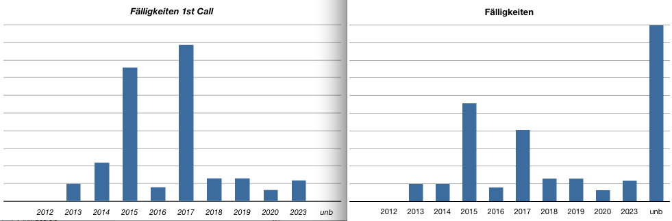 Ramstein Oktober 2, 2012 Zum Quartalswechsel ist mit dem Aareal GS 804118 ein gutes Investment leider ausgelaufen. Es gab dafür aber angemessenen Rendite (gut 12% p.a. seit dem kauf im Frühjahr 2010). Dazu kamen noch ein paar Kurzfristpeanuts aus Last-Minute-Käufen. Ebenfalls aus Wiesbaden kamen die Quartalszinsen der 778998; immer wieder gern gesehen. Aus kürzlichen Käufen habe ich noch ein paar eterna Mode Holding und die Enterprise Hldg. Ltd im Depot; da hoffe ich noch auf Kurssteigerungen, wenn die kurzfristigen Zeichnunggewinnspekulanten aus dem Markt raus sind. In diesem Jahr sind aus dem Bestand keine Fälligkeiten mehr; der Schwerpunkt liegt bei drei bis fünf Jahre (sofern Hybride gekündigt werden). Der CY auf Basis der Kaufkurse liegt bei gut 7%, der YtM bei gut 10%. Sofern Ausfälle nicht daran nagen. Liquidität ist vorhanden, auf gute Kaufgelegenheiten warte ich noch. Diesen Beitrag teilen Link zum Beitrag