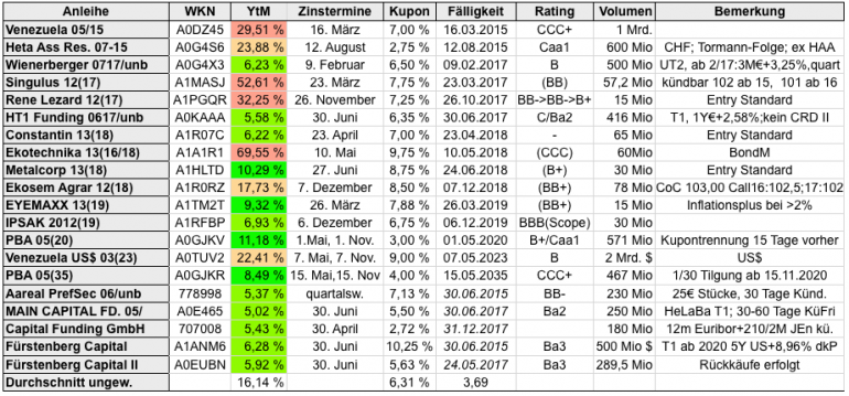 Ramstein November 14, 2014 Nach einem Einbruch unter 90 sind die Sanha 13(18) wieder über 100; ich nutze das zu einem Verkauf bei 102. Damit haben sie 8,9% Rendite eingefahren. Im Laufe der Zeit werde ich mein Engagement in den Mittelstandsbonds wohl weiter zurückfahren (Regel 23). Die CHF Heta Ass. Res. 07(15) habe ich zu 93 weiter aufgestockt. Zinsen gab es bei PBA20 (inkl. fiktive Quellensteuer) und Venezuela US$ 23. Die Rendite des Bonddepots (Autokorrektur meint: Bundespost) dieses Jahr hat deutlich gelitten (Ekosem, Ekotechnika, Venezuela, Griechenland), aber noch sehe ich keine Grund für Panikattacken; immerhin sind es noch +5%. Arabeske: Apple-Aktien auf neuem Allzeithoch (+70% seit Kauf im Januar) und Dividende gab es auch. Diesen Beitrag teilen Link zum Beitrag