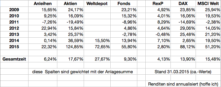 Ramstein April 6, 2015 · bearbeitet April 6, 2015 von Ramstein Persönliche Asset-Performance-Arabeske Immer wieder wird mit deutlichem Engagement argumentiert, dass aktive Fonds, ETFs, oder Einzelaktien die bessere Anlage sind. Die Überzeugungen sind ebenso stark wie (in den meisten Fällen) unbelegt durch eigene Fakten. Ich habe jetzt mal die letzten Jahre der Toter-Baum-Ablage aufgearbeitet und in meinen Spreadsheets ergänzt. Dazu habe ich noch allgemeine Benchmarkdaten genommen und dann diese nette (natürlich rein subjektive) Tabelle erzeugt: Ich habe in dem Prozess auch noch einige Fehler in meinen Daten gefunden und korrigiert und hoffe, dass jetzt alles stimmt. Achtung: die Daten sind nicht direkt vergleichbar mit meinem ETF-Weltdepot, denn da habe ich die Immobilien dazu genommen, während sie in obiger Tabelle bei den Fonds sind. Rein subjektiv betrachtet: Mein Bonddepot hat besser abgeschnitten als der RexP. Meine Aktien liefen leicht besser, aber auch deutlich volatiler als der MSCI Welt. Meine ETFs liefen seit Anfang 2014 (Start Weltdepot) besser als die aktiven Fonds. Meine aktiven Fonds liefen fast immer schlechter als der MSCI Welt. PS: Das zeigt natürlich nicht unbedingt die Gesamtperformance bei regelmäßigem Rebalancieren zwischen den Assetklassen, insbesondere wenn wir mal wieder einen richtigen Markteinbruch haben. PPS: Bei anderen kompetenteren (oder glücklicheren) Anlegern kann es natürlich ganz anders aussehen. PPPS: Ich fand die Aufbereitung der Daten in dieser Form sehr interessant. Diesen Beitrag teilen Link zum Beitrag