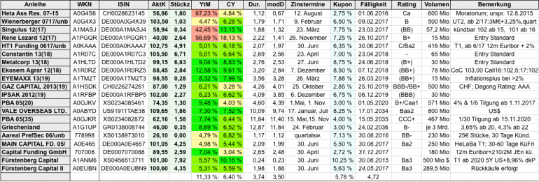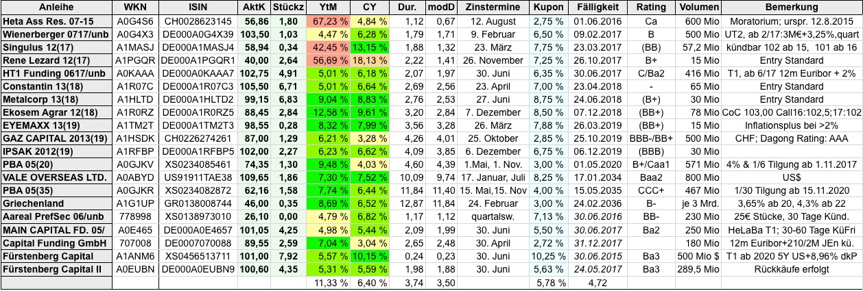 Ramstein April 4, 2015 Ich habe die freien Tage genutzt und etwas an meiner Depotverwaltung rumgespielt. Als erstes Ergebnis hier mal den aktuellen Stand des Bonddepots: Die letzte Zeile enthält (im Gegensatz zu früheren Versionen) jetzt den wertmäßig gemittelten Durchschnitt. Die Griechenlandtauschanleihe ist ein Platzhalter für den ganzen Strauss an Kleinnominalen; ich wollte der Übersicht halber nicht alle einzeln aufnehmen. Diesen Beitrag teilen Link zum Beitrag