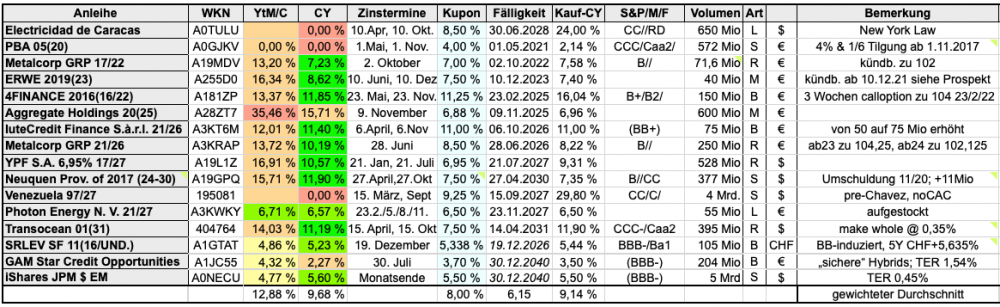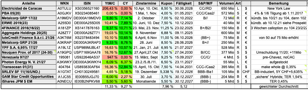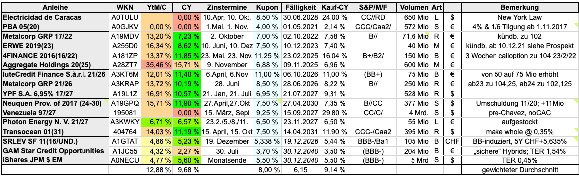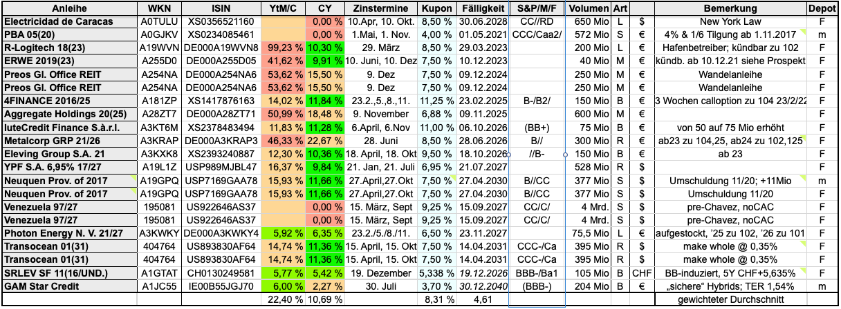 Ramstein März 12, 2022 · bearbeitet März 13, 2022 von Ramstein Die Aktien haben dieses Jahr von den Anlegern Stressresistenz gefordert. Bei den Anleihen sieht es aber nicht besser aus. Das Bonddepot hat ein Minus von 9,64% bis heute. Risikoanleihen korrelieren nun mal sehr stark mit Aktien. Wenn man sich die Renditen anschaut , müsste man eigentlich zugreifen und aufstocken: Man beachte: "eigentlich". Werden die deutschen Immobilienanleihen ohne Umschuldung überleben? Was sind die Auswirkungen des Ukrainekonflikts auf die "Wucherer"? Gibt es bei Venezuela Hoffnung? (Handelbar sind sie sowieso nicht.) Zahlt Buenos Aires noch, obwohl sich scheinbar niemand um die ausgelaufenen Anleihen kümmert? Profitieren Metalcorp, YPF und Transocean von den stark gestiegenen Rohstoffpreisen? Alles Punkte, bei denen ich mir keine überzeugende Antwort zutraue. Diesen Beitrag teilen Link zum Beitrag