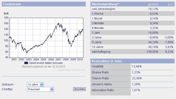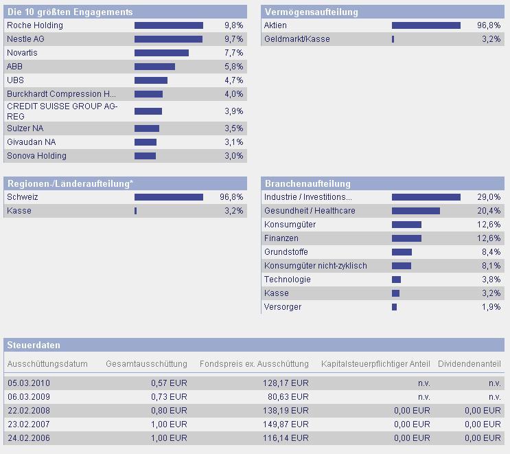 ghost_69 Oktober 23, 2010 · bearbeitet Oktober 23, 2010 von ghost_69 DWS Zürich Invest Aktien Schweiz Fondsporträt Der Fonds investiert vorzugsweise in Aktien erstklassiger schweizer Unternehmen. Meist handelt es sich dabei um international tätige Konzerne, die in überdurchschnittlich hohem Mae vom Trend zur Globalisierung profitieren können. Ziel ist es, langfristig einen möglichst hohen Wertzuwachs zu erzielen. Basisdaten WKN / ISIN: 849014 / DE0008490145 Fondsgesellschaft DWS Investment GmbH Fondsmanager Herr Ralf Rybarczyk Anlageregion Schweiz Anlageschwerpunkt Aktienfonds Large Cap Benchmark SPI Risikoklasse 4 Fondsvolumen 242,60 Mio. EUR Auflegungsdatum 17.01.1994 Ertragsverwendung ausschüttend Geschäftsjahr 1.1. - 31.12. Garantie Nein Laufzeit unbegrenzt Kauf / Verkauf Ja / Ja VL-fähig Ja Kosten Ausgabeaufschlag (effektiv) 5,00% (4,76%) All-in-Fee 1,30% Gesamtkostenquote (TER) 2009 1,30% Hier das Fachsheet: DWS Zürich Invest Aktien Schweiz.pdf Ich finde diesen Schweizer Fonds als eine gute Beimischung zu einem Depot, da die Werte recht solide sind und man dadurch Schwakungen abfangen kann, die Jungs dort haben CHF, keinen Euro oder Dollar, bei mir kommt er auf die Watchlist. Hier der Link zur Gesellschaft: http://www.dws.de/DE/facts/FactSheetOverview.aspx?FundId=335 Aktueller KommentarDer SPI rückte im September um 2,4% auf 5,595 Punkte vor. Erneut richtete sich das Anlegerinteresse vor allem auf makroökonomische Themen wie die Schuldenkrise in den europäischen Randstaaten. Ebenfalls im Fokus stand der Bankensektor, nachdem sich die Regulierungsbehörden auf schärfere Eigenkapitalvorschriften für europäische Finanzinstitute verständigt haben. Bei den Einzeltiteln überragte Transocean (+20,4%), nachdem das Bohrloch im Golf von Mexiko endgültig versiegelt werden konnte und die Umweltschäden durch die Ölpest geringer als befürchtet zu sein scheinen. Der Luxusgüterhersteller Richemont legte nach Vorlage starker Umsatzzahlen 19,4% zu. Kühne+Nagel veröffentlichte auf dem Investorentag sehr optimistische Langfristziele und gewann 12,8%. Sehr schwach entwickelten sich dagegen die Valoren von Actelion (-9,7%), nachdem Studien zu einem neu entwickelten Medikament nicht die gewünschte Wirkung aufzeigen konnten. Die Credit Suisse verlor im Monatsverlauf 6,7% nach sehr verhaltenen Aussagen zum Geschäftsverlauf der Investment Banking-Sparte für das dritte Quartal 2010. Aufgrund der anhaltend sehr selektiven Börsenverfassung konnte der Fonds wiederum überproportional zulegen. Fondsmanager: Ralf Rybarczyk Ghost_69 :- Diesen Beitrag teilen Link zum Beitrag