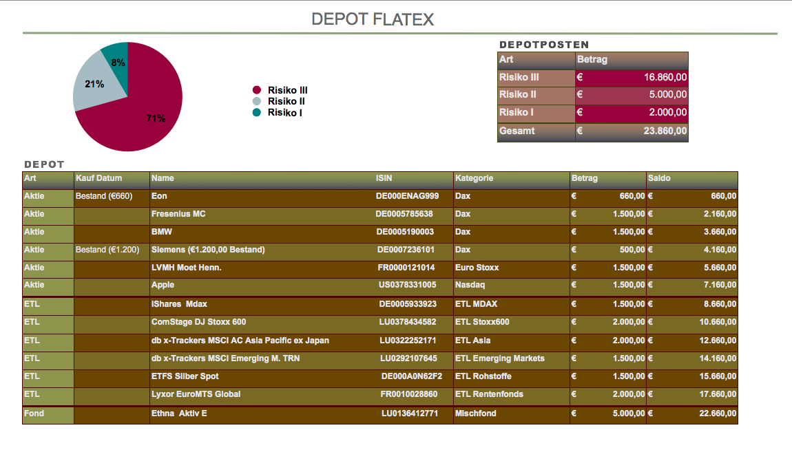 Das Depot ist also eher auf Gewinnmaximierung mit überschaubarem Risiko gebaut und ist auf 5-7 Jahre ausgelegt. Die Anlagesumme von ca. 20.000,00 kann nach oben verändert werden, man kann es schon als Testlauf bezeichnen.