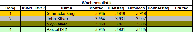 schnuckelking Oktober 31, 2010 · bearbeitet Oktober 31, 2010 von schnuckelking Wettspiel: DAX intraday tippen Herzlich Willkommen zum DAX intraday tippen! +++ Jeder ist herzlich eingeladen +++ Spieldauer: 1 Woche / tägliche Tippabgabe Wann wird getippt: tägliche Tippabgabe bis 02.00 Uhr möglich Ein Einstieg während der Tippwoche ist möglich! Was wird getippt: DAX a. DAX Schlussstand des folgenden Tages b. DAX Höchststand des folgenden Tages Punkteberechnung: Die Start-Punktezahl beträgt 4.000 Punkte Beispiel: a. Schlusstand: Tipp: 5.345 ------------ Istwert: 5.300 Differenz: 45 b. Höchststand: Tipp: 5.380 ----------------- Istwert: 5.400 Differenz: 20 45 + 20 = 65 Punkte Abzug Punktezahl nach dem ersten Tipptag: 4.000 Startpunkte - 65 = 3.935 Punkte Wer am Freitag die höchste Gesamtpunktzahl hat, ist der Sieger !!! Sollte jemand an bestimmten Tagen nicht tippen können, hat er die Möglichkeit seinen Tipp vorab abzugeben. Tage ohne Tippabgabe werden mit dem höchsten Tagespunktabzug + 1 bewertet. Sonderpunkte: Tippabgabe zwischen 24.00 Uhr - 02.00 Uhr = 25 Strafpunkt Tippabgabe vor 18.00 Uhr = 25 Gutschriftpunkte (außer bis Sonntag Abend) Genaue Punktzahl eines Tageswertes (gerundet +/- 1) getippt = 50 Gutschriftpunkte Gewinn: Der Sieger der jeweiligen Woche erhält unter seinem Avatar den DAX-Intraday-Tippen-Wanderpokal Quartalspokal: Zusätzlich zum Wochen-Wanderpokal kann aufgrund der Quartalstabelle ein Quartal-Wanderpokal gewonnen werden, der den Sieger ein Quartal lang behalten darf! Die Quartalstabelle wird auf der Basis der Podiumsplätze ermittelt. Diesen Beitrag teilen Link zum Beitrag