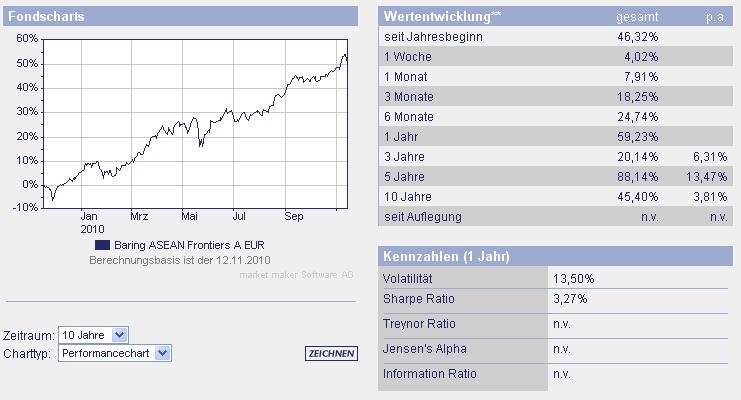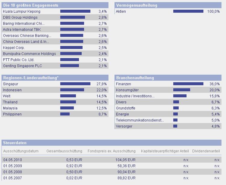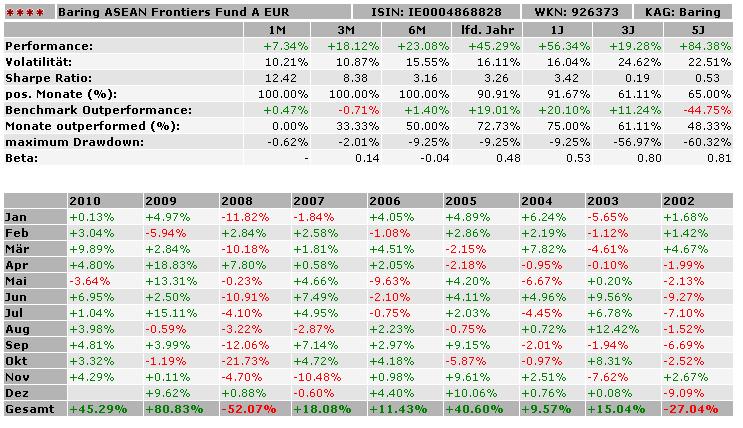 ghost_69 November 14, 2010 · bearbeitet November 14, 2010 von ghost_69 Baring ASEAN Frontiers Fund (EUR) Fondsporträt Das Anlageziel des Fonds ist ein langfristiger Kapitalzuwachs. Der Fonds investiert in Aktien von Unternehmen in Asien, vor allem in Ländern, die Mitglieder der Vereinigung südostasiatischer Nationen (ASEAN) sind, und die nach Ansicht des Fondsmanagements vom Wirtschaftswachstum und der Wirtschaftsentwicklung der Region profitieren. Zu den Mitgliedern von ASEAN zählen Singapur, Thailand, die Philippinen, Malaysia, Indonesien und Vietnam. Basisdaten WKN / ISIN: 926373 / IE0004868828 Fondsgesellschaft Baring International Fund Managers (Ireland) Limited Fondsmanager Soo-Hai Lim Anlageregion ASEAN Anlageschwerpunkt Aktienfonds All Cap Benchmark MSCI All countries Asia Pacific Risikoklasse 4 Fondsvolumen 231,20 Mio. EUR Auflegungsdatum 10.10.1978 Ertragsverwendung ausschüttend Geschäftsjahr 1.5. - 30.4. Garantie Nein Laufzeit unbegrenzt Kauf / Verkauf Ja / Ja VL-fähig Nein Kosten Ausgabeaufschlag (effektiv) 5,00% (4,76%) Depotbankgebühr p.a. 0,10% Managementgebühr p.a. 1,25% Gesamtkostenquote (TER) 2010 1,80% Das Fachsheet: Baring Asean Frontiers Fund (EUR).pdf Ich bin auf diesen Fonds aufmerksam geworden, da die Leute von Baring die Länderverteilung geändert haben, hier sind die Länder die in Asien die größten Wachstumsaussichten haben, ich bin drauf gestoßen da ich auf der Suche nach mehr Singapur und Indonesien war, aber keinen Einzelfonds auf diese Länder wollte. Kennt jemand vielleicht noch eine Alternative ? Erstmal kommt er auf die Watchlist zu den anderen 99 Fonds. Ghost_69 :- Diesen Beitrag teilen Link zum Beitrag