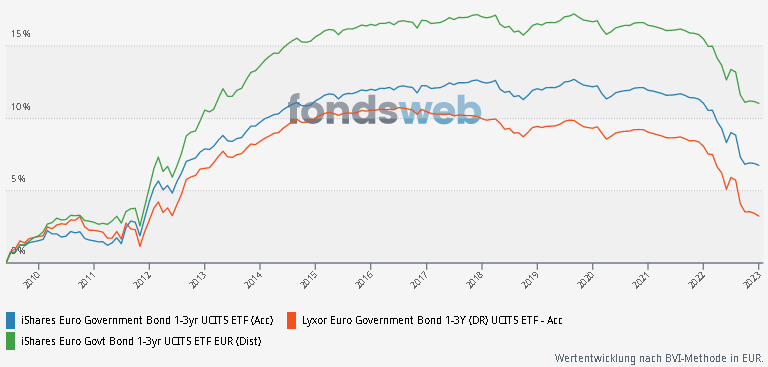 stagflation Februar 1, 2023 · bearbeitet Februar 2, 2023 von stagflation @scand159: zunächst muss man bei den diversen Charting-Tools im Internet aufpassen. Viele Charts stimmen nicht, weil die Tools Fehler machen: Kursverläufe in € und in US-$ werden ohne Umrechnung im selben Diagramm angezeigt Kursverläufe von ausschüttenden und thesaurierenden ETFs werden ohne Umrechnung im selben Diagramm angezeigt usw. Deshalb habe ich mir das Diagramm noch einmal bei Fondweb anzeigen lassen. Diesem Tools vertraue ich, weil es bisher immer gestimmt hat, wenn ich mal detailliert nachgerechnet habe. Und es zeigt auch immer die Wertentwicklung an - auch bei ausschüttenden ETFs. (Quelle) Das Diagramm sieht genauso aus wie bei Dir - deshalb ist Dein Diagramm wohl in Ordnung. Unterschied zwischen den beiden iShares ETFs: Wenn man sich das Diagramm nur von 2015 bis heute anzeigen lässt, sieht man, dass blaue und grüne Linie exakt übereinander liegen. Vor 2015 ist das nicht so. Es muss also etwas anders gewesen sein! @chirlu hat schon darauf hingewiesen: im Juni 2014 wurde der Index gewechselt, den der iShares Euro Govt Bond 1-3yr UCITS ETF EUR (Dist) trackt. Man sieht es im Factsheet: Die Unsitte, dass ETFs ihren Index wechseln, greift leider immer mehr um sich (siehe auch dieser Thread). Leider haben die ETF-Anbieter nicht den Anstand, das auch deutlich zu kennzeichnen und keine Performance-Daten für Zeiträume zu veröffentlichen, die einen Zeitbereich vor dem Index-Wechsel enthalten. Man muss beim Vergleich historischer Daten also genau aufpassen. Unterschied zwischen Lyxor und iShares: Die beiden ETFs tracken unterschiedliche Indexe: der iShares trackt den "Barclays Euro Government Bond 1-3yr Term Index" und der Lyxor den "MTS Mid Price Investment Grade Eurozone Government Bond 1-3Y Index". Die Mod. Duration ist gleich. Der Lyxor hat etwas weniger Risiko und eine etwas geringere Rendite. Man kann also NICHT sagen, dass der Lyxor schlechter wäre als der iShares ETF. Diesen Beitrag teilen Link zum Beitrag