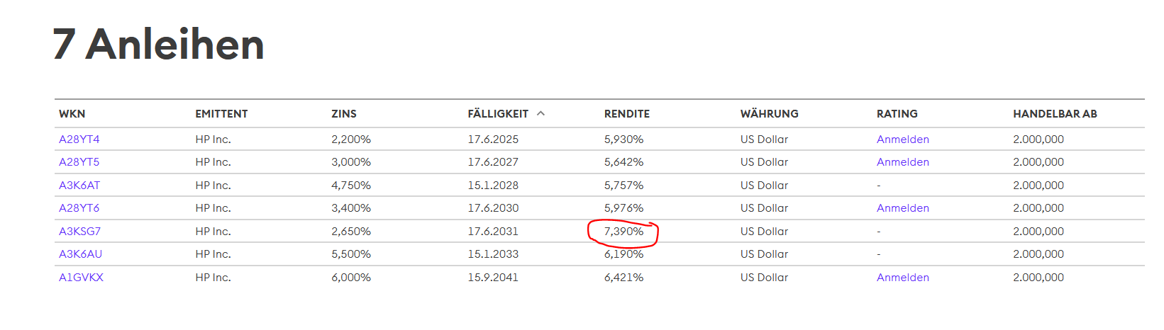 B3n September 7, 2023 vor 9 Stunden von Actionic: Die fällt bzgl der Rendite gegenüber den anderen von HP inc etwas auf: Also SBroker lässt nicht trotz Fehlermeldung beim BIB bis zur Orderaufgabe. Zumindest ein Teil der Differenz sollte sich dadurch erklären lassen das die Anleihe nur in Stuttgart und Frankfurt ( mit ordentlichem Spread) handelbar ist. Heimatbörse ist auch Frankfurt und keine Notierung in den USA. Alle anderen aufgeführten Anleihen sind in den USA + Deutschland + teilweise weitere Länder notiert. Diesen Beitrag teilen Link zum Beitrag