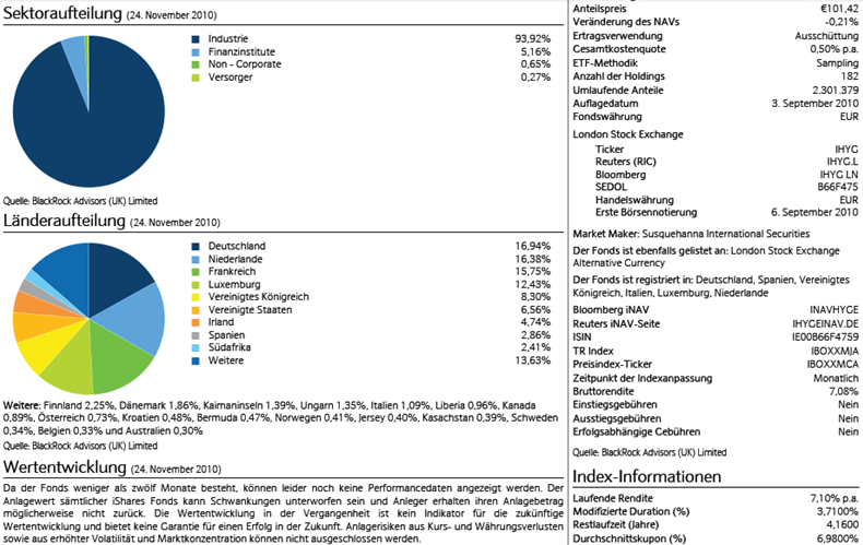 Bärenbulle November 26, 2010 iShares, der ETF-Anbieter von BlackRock, listet den weltweit ersten europäischen High Yield ETF an der Deutschen Börse: den iShares Markit iBoxx Euro High Yield. Dieser physisch replizierende iShares ETF investiert in die liquidesten hochverzinslichen Euro-Unternehmensanleihen. Facts, Factsheet etc: http://de.ishares.com/de/pc/fonds/IHYG Eigentlich ein schönes Teil. Wie immer kommt es nicht unbedingt zum besten Zeitpunkt. Mich würden folgende Fragen interessieren: 1) Eignet sich der ETF zur Diversifikation in einem Wachstumsorientierten Portfolio? Wie war die historische Korrelation des iBoxx Euro High Yield zu Aktien? 2) Wie hoch war die historische Durchschnittrendite des iBoxx Euro High Yield? 3) Wie seht Ihr eine Investition aktuell unter Markttiminggesichtspunkten? Was meint Ihr? Diesen Beitrag teilen Link zum Beitrag