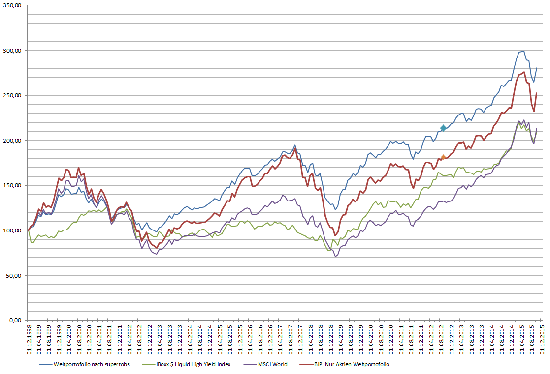 PopOff November 9, 2015 · bearbeitet November 10, 2015 von PopOff So nun habe ich auch mal den Iboxx High Yield Global Index hergenommen und diesen mit ein Weltportofolio ala supertobs verlichen. Beim WPF habe ich ein rebalancing immer im März vorgenommen. Finde der High Yield Global Index schlägt sich hier auch recht wacker. Edit: High Yield Index wurde in Euro umgerechnet Diesen Beitrag teilen Link zum Beitrag