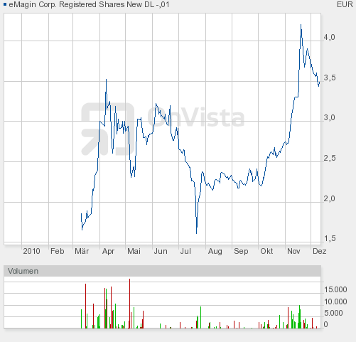 klausk Dezember 12, 2010 Erst mal vorab, ein Schnellschuß: Meine erste Reaktion war, daß es sich hier um eine windige "Empfehlung" aus einer obskuren Ecke (Börsenbrief o.ä.) handelt. Ein Push-Versuch kann es immer noch sein, denn bei eMagin (US-Ticker: EMAN) handelt es sich um eine Microcap-Aktie mit einem Durchschnittsumsatz von rund 100.000 Stück, so daß jeder nennenswerte Trade den Kurs bewegt. Die Technologie ist immer noch im Frühstadium des kommerziellen Einsatzes, aber die Zahlen sind beachtlich und die IBD-Ratings sogar vorzüglich. Positive Cashflow, no debt. Spekulativ auf solider Basis. Diesen Beitrag teilen Link zum Beitrag