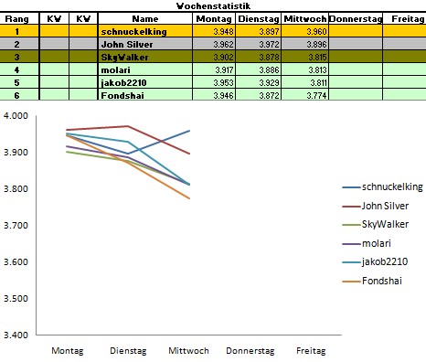 schnuckelking Januar 2, 2011 Wettspiel: DAX intraday tippen Herzlich Willkommen zum DAX intraday tippen! +++ Jeder ist herzlich eingeladen +++ Spieldauer: 1 Woche / tägliche Tippabgabe Wann wird getippt: tägliche Tippabgabe bis 02.00 Uhr möglich Ein Einstieg während der Tippwoche ist möglich! Was wird getippt: DAX a. DAX Schlussstand des folgenden Tages b. DAX Höchststand des folgenden Tages Punkteberechnung: Die Start-Punktezahl beträgt 4.000 Punkte Beispiel: a. Schlusstand: Tipp: 5.345 ------------ Istwert: 5.300 Differenz: 45 b. Höchststand: Tipp: 5.380 ----------------- Istwert: 5.400 Differenz: 20 45 + 20 = 65 Punkte Abzug Punktezahl nach dem ersten Tipptag: 4.000 Startpunkte - 65 = 3.935 Punkte Wer am Freitag die höchste Gesamtpunktzahl hat, ist der Sieger !!! Sollte jemand an bestimmten Tagen nicht tippen können, hat er die Möglichkeit seinen Tipp vorab abzugeben. Tage ohne Tippabgabe werden mit dem höchsten Tagespunktabzug + 1 bewertet. Sonderpunkte: Tippabgabe zwischen 24.00 Uhr - 02.00 Uhr = 25 Strafpunkt Tippabgabe vor 18.00 Uhr = 25 Gutschriftpunkte (außer bis Sonntag Abend) Genaue Punktzahl eines Tageswertes (gerundet +/- 1) getippt = 50 Gutschriftpunkte Gewinn: Der Sieger der jeweiligen Woche erhält unter seinem Avatar den DAX-Intraday-Tippen-Wanderpokal Quartalspokal: Zusätzlich zum Wochen-Wanderpokal kann aufgrund der Quartalstabelle ein Quartal-Wanderpokal gewonnen werden, der den Sieger ein Quartal lang behalten darf! Die Quartalstabelle wird auf der Basis der Podiumsplätze ermittelt. Diesen Beitrag teilen Link zum Beitrag