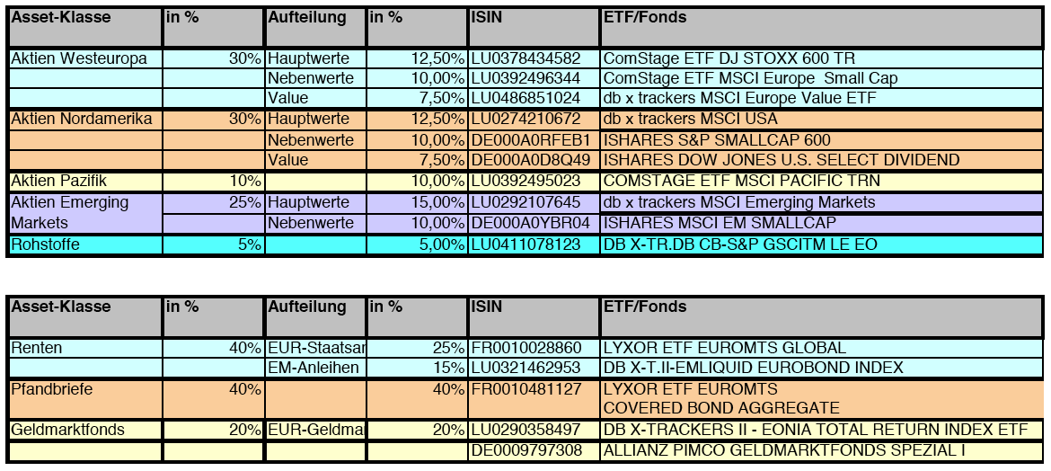 Nudelesser Januar 10, 2011 Deine Tabelle mal als Grafik: Das ist ein sehr klassisches an Kommer angelehntes "Weltportfolio". Das muss nichts schlechtes sein (im Gegenteil) , aber jeder noch so kleine Vor- und Nachteil dürfte hier im Forum bereits umfassend ausdiskutiert sein. Was noch auffällt ist, dass (ausländisch) thesaurierende ETFs stark vertreten sind. Das könnte sowohl das Rebalancieren (weil hierfür keine Ausschüttungen zur Verfügung stehen) als auch den Umgang mit dem Finanzamt (sofern man die aktuelle Regelung versteht und Ernst nimmt) etwas aufwendiger machen. Diesen Beitrag teilen Link zum Beitrag