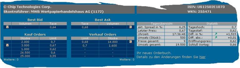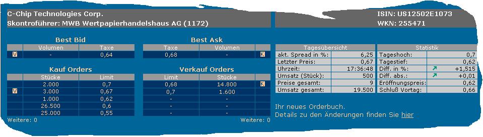 Milsten Januar 27, 2004 Bisher gabs +19.71% in den USA und folgende gute Newsmeldung: MONDAY , JANUARY 26, 2004 04:45 PM MONTREAL, QUEBEC, Jan 26, 2004 (CCNMatthews via COMTEX) -- C-Chip Technologies Corporation (OTCBB: CCHI) is pleased to announce that it has concluded an agreement with the CBM Group Inc. to develop and market wireless telemetry devices offering, through a Web-based application, the ability to remotely access, control and manage consumer electronic products, including plasma screens, TVs and other home appliances. As per the agreement, the CBM Group Inc will accept a first delivery of 10,000 units of a projected total of 120,000 units within the 12-month period following the initial delivery. Stephane Solis, President & CEO of C-Chip stated: "We are extremely pleased to see that the technology that we have developed for credit management in the automotive sector over the past few years is now finding a much wider application for use in consumer products. This is a real breakthrough for us, enlarging our potential growth far beyond what we could have imagined not long ago." Branded as the MP2, the C-Chip devices will enable credit granters to use the internet to access, monitor and control the use of the assets that they leased or financed to consumers. The devices will also offer security features such a motion detection to alert a central monitoring center in case of theft, or unauthorized movement. David Porter, President & CEO of the CBM Group Inc. says: "After having done extensive research in the field, we can conclude that the MP2 developed by C-Chip opens a new era in credit and security management. We foresee a huge market for telemetry devices such as the MP2 which should be offered for less than US$150 per unit, plus nominal usage fees for high end units, and other versions offered for much less. Besides utility service providers who have the ability to shut service down in case of non-payment, the MP2 will be the only device that will offer credit granters the ability to control and enforce schedule of payments for basic consumer appliances." James Mashtoub, COO of C-C-Chip indicated: "The MP2 is performing quite well and I can only thank my engineering team for the outstanding job they have done in quickly adapting our core technology, to apply it to products outside the automotive industry. We should be able to begin commercial delivery of the first version of the MP2 to the CBM Group no later than April 2004." About the C-Chip Technology The C-Chip is a new wireless, web-based set of communication tools that offers business users remote access, control, and monitoring of a wide range of assets, including vehicles, office equipment and industrial machinery. It allows selective enabling, disabling and any other commands at will, from anywhere to practically anywhere in North America using the Internet. Applications for the C-Chip technology offers significant opportunities within the markets for credit, security and asset management solutions. Detailed information on the technology and its applications is available on our web-site at www.c-chip.com. Diesen Beitrag teilen Link zum Beitrag
