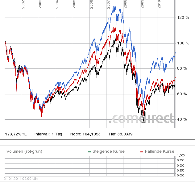 Chemstudent Januar 23, 2011 Wow, der Fonds hat's noch nichtmal geschafft, den EuroStoxx Preisindex zu schlagen. SChwarz: Postbank Global Europa (977028) Rot: EuroStoxx Preisindex in EUR Blau: EuroStoxx mit Nettodividenden in EUR Da hat der Bankverkäufer damals ja schon bewiesen, wie super er die künftigen Top-Anlagen finden kann. Und diesem Verkäufer, der sich dreist "Berater" nennt, willst du nun weiterhin vertrauen? Obwohl er dir Unsinn erzählt wie "es wird schwierig für den Fonds Käufer zu finden, wenn sie jetzt nicht verkaufen"? Der Verkäufer will dich nur ausnehmen wie eine Weihnachtsgans. Mehr nicht. Also:Schick ihn zum Teufel und kümmere dich selbst um dein Geld. Oder - falls dir das zu viel ist - wende dich an einen Honorberater. Alles andere ist Humbug. Diesen Beitrag teilen Link zum Beitrag