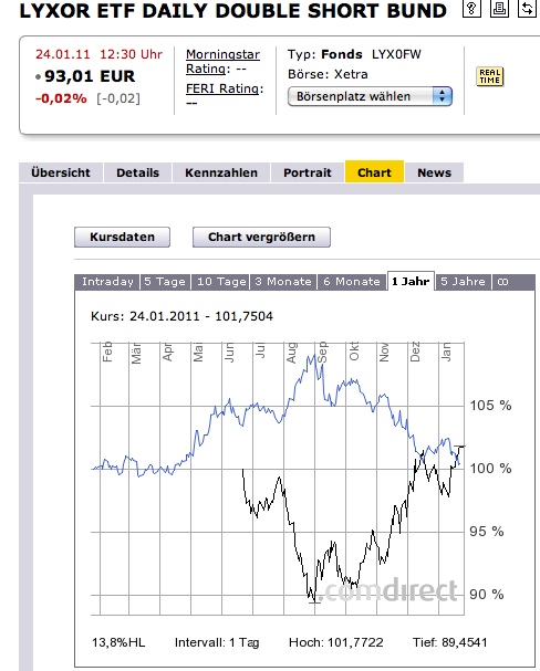 Zinsjäger Januar 24, 2011 · bearbeitet Januar 24, 2011 von Zinsjäger Die Wette auf steigende Zinsen gehe ich gerne mit ein, da bin ich dabei. Der Double Short Bund (WKN: LYX0FW) scheint ganz gut zu sein in der gehebelten Abbildung/Replikation Blau = Bund Future Schwarz = Short ETF Diesen Beitrag teilen Link zum Beitrag