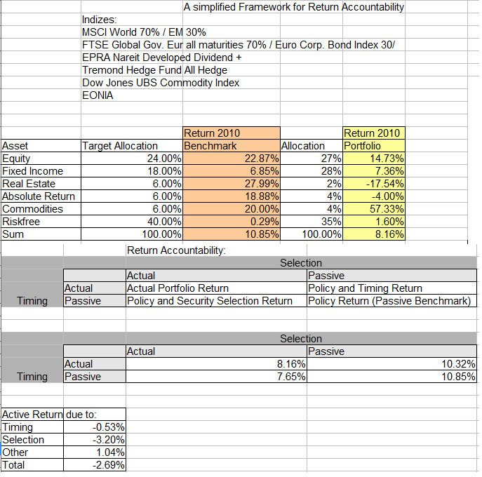 Schinzilord Januar 24, 2011 · bearbeitet Januar 24, 2011 von Schinzilord Hallo! Heute möchte ich euch ein wunderschönes Paper aus dem Jahre 1986 vorstellen, welches meines Erachtens absolut zeitlose Konzepte enthält: Determinants of Portfolio Performance von Gary P. Brinson, L. Randolph Hood, and Gilbert L. Beebower (BHB1986_determinants of portfolio performance.pdf) In diesem Paper geht es um ein einfaches Konzept, wie man herausfindet, woher die Renditeverteilung in eurem Depot im Vergleich zu eurer Benchmark wirklich herkommt. Dazu braucht es nicht viel: Eine Assetklassendefinition (bei mir Aktien, Anleihen, Immobilien, Abs. Return, Rohstoffe) die Gewichte der einzelnen Assetklassen eurer Benchmark und eures Portfolios und die Renditen der Assetklassen eurer Benchmark und eures Portfolios Dann geht alles ganz schnell: Alles in eine Matrix eintragen und berechnen lassen. Beispiel: Unter Actual / Passive steht die Summe aus allen Einzel-Gewichten aus dem aktiven Portfolio je Assetklasse multipliziert mit der Benchmarkassetklassenrendite): also z.B. 28% Aktienallokation * 20% Benchmarkaktienrendite + 72% Anleihenallokation * 5% Anleihenrendite). Dies ist dann euer Policy und Timing Return, weil es euer Markttiming (die Auswahl der Assetklassen) gewichtet mit der Benchmarkrendite. Im Feld Timing Passive / Selection Actual ist dann eure Security Selection Return gewichtet mit der passiven Benchmark (also die Rendite, die eure ausgewählten Assetklassen in eurem Portfolio gemacht haben, wenn ihr jeweils so viele Anteile wie in der Benchmark festgelegt gehabt hättet). etc. pp. Hier habe ich es mal für mein Portfolio gemacht: Und ich bin gnadenlos durchgefallen. Sowohl bei Timing als auch bei der Auswahl versemmelt. Bei "Other" habe ich zulegen können, das liegt wohl v.a. an meinen Sparplänen und demzufolge an der Umschichtung zwischen den einzelnen Assetklassen. Da ist der Durchschnitt natürlich nur eine Näherung. Im Gesamten habe ich meine Benchmark underperformt. Dies liegt aber v.a. an den geringeren Gewichten der gutgehenden Assetklassen Rohstoffe, Immobilien und Abs. Return. Hier muss ich erst noch meine Positionen aufbauen. Wenn ich noch das Risiko mit reinnehmen würde, würde es besser aussehen (ich habe leider nur monatliche Daten = Schmarrn). Bei selection bin ich wohl auch deswegen so daneben, weil ich meinen geschlossenen KanAm gegen ein REIT Benchmark laufen lassen. Der Abschlag von 25% gegenüber REIT +27% bricht mir das Genick. Aber jetzt bitte keine Ausflüchte von wegen "ich kann für mich keinen Benchmark definieren" etc. Mit einem kann man ja immer mal anfangen. Und selbst wenn es nur eine grobe Aufteilung zwischen Aktien und Anleihen ist. Ich finde es eine nette Spielerei und ein gewisses Selbstmonitoring. Ich sollte auch die Zocks und Spielereien lassen.... Nachtrag für die Interessierten: In dem Paper wird noch die Kernaussage gemacht, dass 90% aller Returnvariabilität von der Asset Allokation herrührt (und nicht wie immer angenommen der Return an sich!). Also immer wenn ihr die Aussage lest, für über 90% der Rendite ist die AA verantwortlich, dann bezieht sich der Schreiber immer auf dieses Paper und liegt nochdazu falsch, weil es nicht die Rendite an sich ist, sondern die Variation (also die Abweichung) der Rendite. Anders gesagt: Wenns nicht so gelaufen ist wie ihr wolltet, hattet ihr zu über 90% die falsche Asset Allocation im Vergleich zu eurer Benchmark. Aber das soll nebensächlich sein. Diesen Beitrag teilen Link zum Beitrag