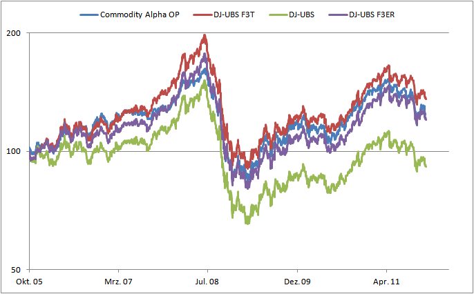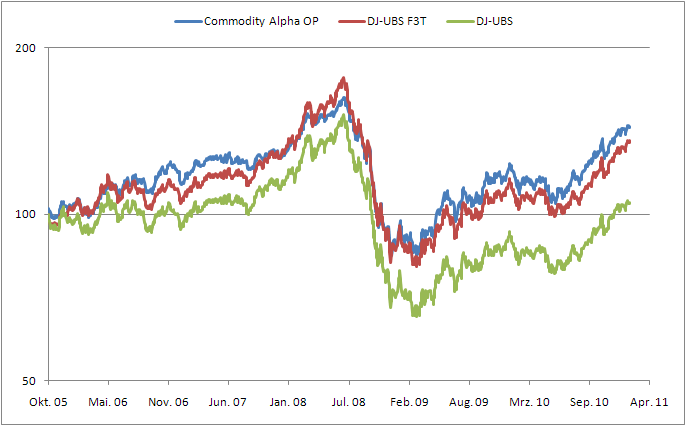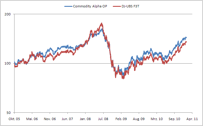 Gegenüber seinem Vergleichsindex DJ UBS TR hat der Commodity Alpha OP laut Factsheet vom 31.12.2010 über gut fünf Jahre rund 36% Outperformance nach Kosten erzielt, was schon eine sehr hohe Outperformance darstellt.