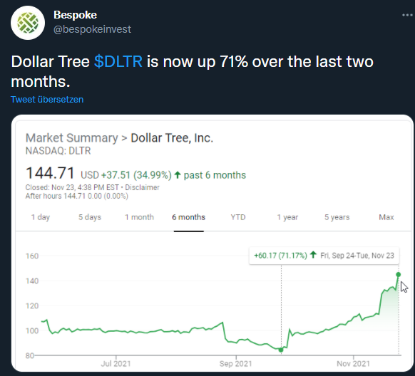 herbert_21 November 30, 2021 · bearbeitet November 30, 2021 von herbert_21 Am 24.11.2021 um 11:45 von Toni: Wozu sollte man DollarTree-Aktien kaufen wenn man DollarGeneral-Aktien kaufen kann? DollarGeneral ist besser aufgestellt und die Aktie läuft sogar besser…. Nach dem "Downgrade" von @Toni jetzt ein Downgrade von Goldman Sachs, Aktie -2% Goldman downgrades Dollar Tree to neutral, says company’s improvements are priced in (Schlagzeile auf CNBC Pro, Paywall) Diesen Beitrag teilen Link zum Beitrag