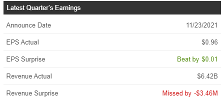 herbert_21 November 23, 2021 · bearbeitet November 23, 2021 von herbert_21 Ehm... Die Short Quote ist mit 3,64% unwesentlich, ich konnte bei Finviz zwei Analysten-Upgrades entdecken: Man kann das Upgrade der Deutschen Bank bei Streetinsider nachlesen. Die letzten Quartalszahlen vs. Erwartungen bei Seekingalpha: Da ich mir nicht sicher war, ob das stimmt, hab ich noch mal bei Earnings Whispers nachgesehen. Dort heißt es: Zitat Dollar Tree (DLTR) reported 3rd Quarter October 2021 earnings of $0.96 per share on revenue of $6.4 billion. The consensus earnings estimate was $0.95 per share on revenue of $6.4 billion. The Earnings Whisper number was $1.06 per share. Revenue grew 3.9% on a year-over-year basis. The company said it expects fourth quarter earnings of $1.69 to $1.79 per share on revenue of $7.02 billion to $7.18 billion. The current consensus earnings estimate is $1.74 per share on revenue of $7.03 billion for the quarter ending January 31, 2022. Weiter zum Transkript der Q3 Earnings vom 21.11.2021. Diesen Beitrag teilen Link zum Beitrag