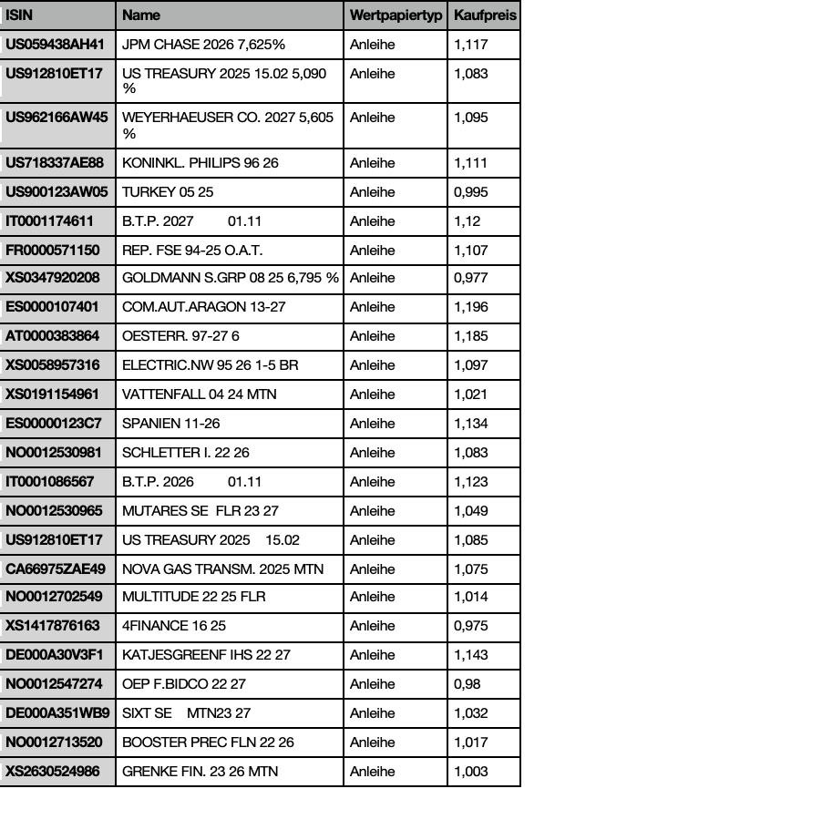 Vielen Dank! Du hast recht, jetzt habe ich etwas dazugelernt. Ich beschäftige mich gerade neu mit dem Thema Anleihen. Unten siehst du meine Einkäufe. Natürlich nur, wenn du Zeit und Lust hast, dir das anzuschauen.