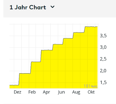 georgi74 November 12, 2023 · bearbeitet November 12, 2023 von georgi74 @AndyzweiDie Rendite entspricht dem Referenzzinssatz der EZB € Short Term https://www.comdirect.de/inf/zinsen/EU000A2X2A25 So hat sich dieser im letzen Jahr entwickelt: Von daher ist klar, dass die Rendite für 1 Jahr keine 3,9% sein kann. Der Zins ist ja erst seit September glaube ich wars so hoch. Diesen Beitrag teilen Link zum Beitrag