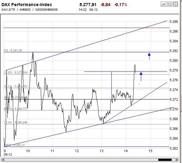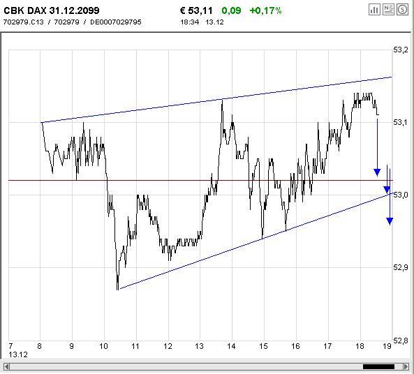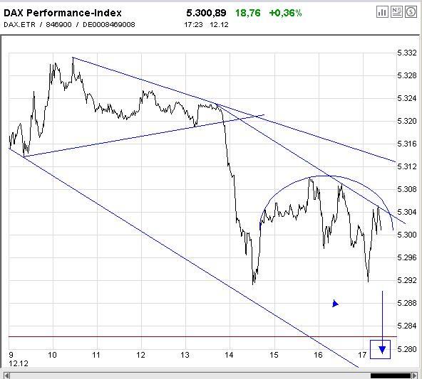 Der Dax befindet sich in einem breit angelegtem Abwärtstrendkanal. Nachbörslich dürfte er m. E. noch die untere Trendlinie anpeilen, dann erst wieder etwas höher getaxt werden, falls die Zeit ausreicht.
