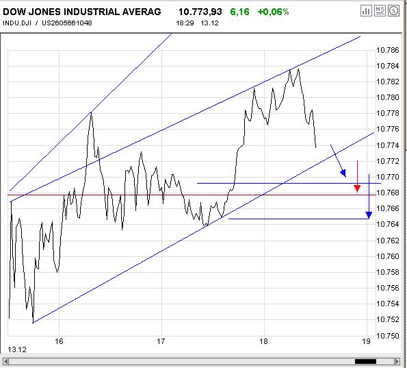 So, jetzt ist mir gerade der Chart Analyzer abgestürzt und all meine Linien sind weg. Der Blick allerdings sagt mir, dass der DJI den Weg des DAX´s in der Abwärtsbewegung gehen wird. Mögliches KZ 10755 -10740 geschätzt.
