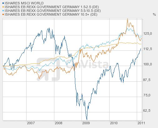 Klaus23 Februar 23, 2011 Für einen ersten Eindruck mal ein Vergleich, wie sich verschiedene Staatsanleihen in den letzten Jahren (vor allem Ende 2008 - 2009) zum MSCI World verhalten haben: Bei einem Depot mit 70% Aktien und 30% Anleihen wird der Unterschied zw. mittleren und langen Laufzeit wohl kaum etwas ausmachen. Entscheidend ist eben zunächst die Gewichtung des Aktienanteils im Depot. Diesen Beitrag teilen Link zum Beitrag