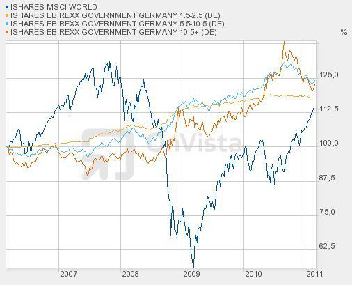zsp1 Februar 23, 2011 Für einen ersten Eindruck mal ein Vergleich, wie sich verschiedene Staatsanleihen in den letzten Jahren (vor allem Ende 2008 - 2009) zum MSCI World verhalten haben: Bei einem Depot mit 70% Aktien und 30% Anleihen wird der Unterschied zw. mittleren und langen Laufzeit wohl kaum etwas ausmachen. Entscheidend ist eben zunächst die Gewichtung des Aktienanteils im Depot. Naja, wenn man es im Nachhinein weiss, würde man natürlich Aktien stark zurückfahren:) Diesen Beitrag teilen Link zum Beitrag