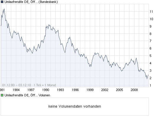 RandomWalker Februar 22, 2011 [ Eine berechtigte Bemerkung. Bei den Aktien weiss aber wirklich keiner wie es in den nächsten Monaten weitergeht. Da sehe ich Market timing sinloss. Bei den Zinsen gehts irgendwann definitv nach oben. Es sei denn Europa wird zum zweiten Japan..... Aber generell gebe ich dir Recht, dass ich versuche mit Anleihen Markettiming betreibe. Danke für die übrigen Tipps Auch ich spekuliere auf steigende Zinsen viel weiter sinken können sie ja nicht mehr. Trotzdem gibt es einen langfristigen Trend, den man auch nicht außen vor lassen darf: Das Bild zeigt die Entwicklung der Umlaufrendite (30% Kurzläufer, 70% Zehnjahresanleihen des Bundes) seit 1981. Erwähnenswert ist hierbei auch die seither ebenfalls stark gesunkene Inflationsrate. Obwohl wir aber seit 15 Jahren ein recht konstante, niedrige Inflation haben, fallen die Zinsen der BRD-Bonds weiter. Diesen Beitrag teilen Link zum Beitrag