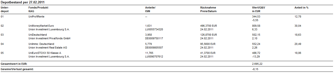 postguru Februar 27, 2011 Insgesamt erhoffe ich mir eine direktere Partizipation an den Märkten als es bei dem Unideutschland der Fall ist wieviel direkter soll es denn sein? Wenn Du doch alles für lau hast, warum dann wechseln. Bei den beiden genannten Banken ist vielleicht der Kauf ab einer bestimmten Summe oder als Sparplan für eine bestimmte KAG kostenlos. Der Verkauf kostet aber normale Ordergebühren. Kannst doch, wenn Du mal Berater wirst, dein Depot dann als ultimatives Musterdepot verkaufen (Scherz) Bei einem Betrag von 2.350 Euro (ohne Riester) würde ich mir da überhaupt keine Gedanken machen und es so belassen. Diesen Beitrag teilen Link zum Beitrag