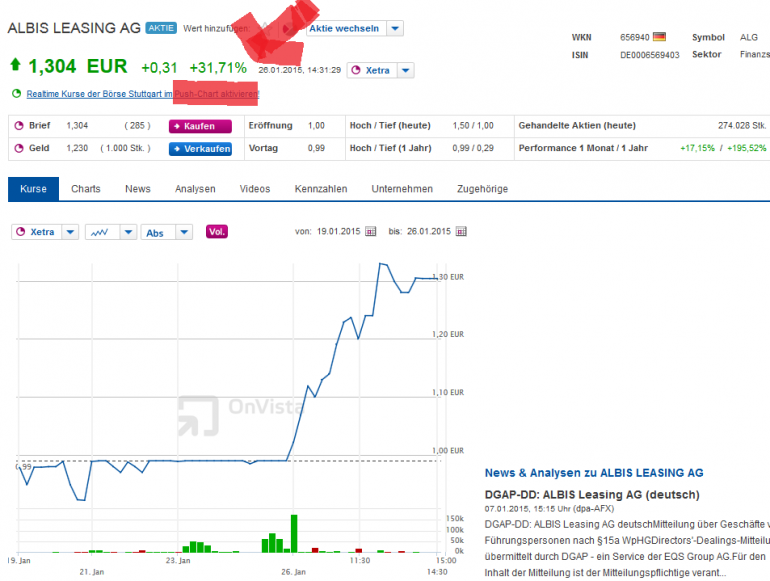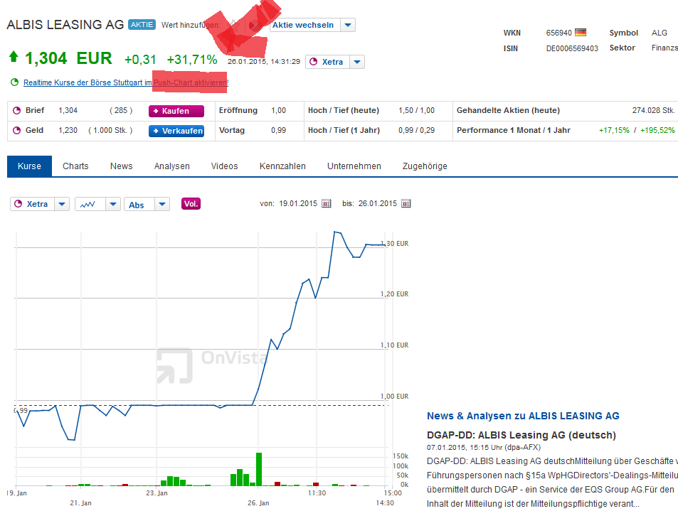 ImperatoM Januar 24, 2015 Hat noch jemand ein Auge auf Albis Leasing? Die aktuelle Entwicklung scheint ein Knaller zu sein! ...Der Gewinn wird demnach im Gesamtjahr die Marktkapitalisierung übersteigen (weiterer Sondereffekt), das Ebt beträgt aber ebenfalls über 1 Mio Euro für das halbe Jahr - und wenn man die 14 Mio Verlustvortrag ausgleichen kann, muss im zweiten Halbjahr da noch einiges nachkommen - passend zu den in der Zwischenmitteilung beschriebenen Umsatzsprüngen! Ich bin heute für rund 79 Cent eingestiegen. Und schon ist das Ding 99 Cent wert. Auf Xetra wurden am Freitag plötzlich 425.000 Stücke gehandelt, also fast 3% der MK. Im Orderbuch steht immer noch ein dicker Verkaufsposten bei 1,00 Euro. Sollte der ebenso schnell genackt werden wie jener bei 99 Cent, ist Polen bald offen. Das wird noch sehr spannend... Diesen Beitrag teilen Link zum Beitrag