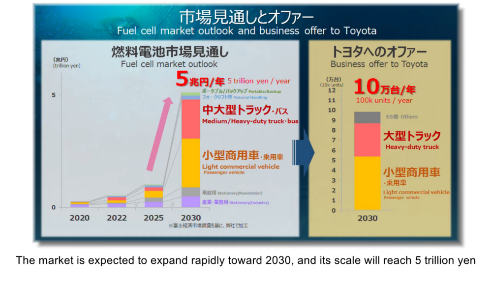 reko Juni 27, 2023 · bearbeitet Juni 27, 2023 von reko Toyota veranstaltete einen Workshop über geplante Entwicklungen u.a. ein bipolarer Akkuaufbau. 2023/06/23 Technical Workshop 2023: Toyota Reveals the Future of Cars with Next-Generation Battery and Hydrogen Technologies. 2023/06/13 How Toyota Plans To Catapult Its Future EV Toward a 600-Mile Range .. using next-gen batteries and sonic technology .. Toyota wants to reduce costs by 20 percent as compared to the existing bZ4X, while also achieving a quick charge time of around 20 minutes or less with its upcoming batteries .. On top of that, Toyota is working on all-solid-state batteries for its EVs, looking to mass-produce them in 2027 or 2028. 2023/06/17 Toyota Says Next-Gen Fuel Cell will Be 50 Percent Cheaper by 2026 .. The next-gen technology will also offer 20 percent more range and less maintenance. Big things are in store for Toyota. In Video 2023/06/13: Hydrogen Business Strategy / Mitsumasa Yamagata, Hydrogen Factory President: 2023/06/20 Toyota and Repsol Sign an Agreement to Decarbonize Transportation With Renewable Hydrogen .. Customers of Toyota fuel cell vehicle fleets will have access to a hydrogen refueling solution provided by Repsol, which will be developed over the next few years. Diesen Beitrag teilen Link zum Beitrag