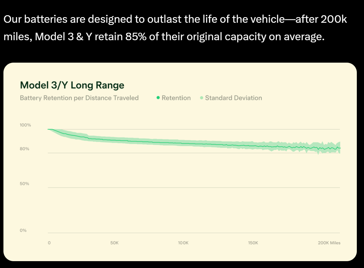 Michalski April 16, 2025 · bearbeitet April 17, 2025 von Michalski Am 15.4.2025 um 08:00 von missionE: Starke Zahlen von Tesla hinsichtlich der Batteriekapazität nach über 200k Meilen: Die Statistik hat einen gewaltigen Survivorship-Bias. Die ausfallenden und ausgetauschten Batterien sind in der Statistik nicht enthalten. Du siehst also nur die gut performenden Akkupacks. Diesen Beitrag teilen Link zum Beitrag