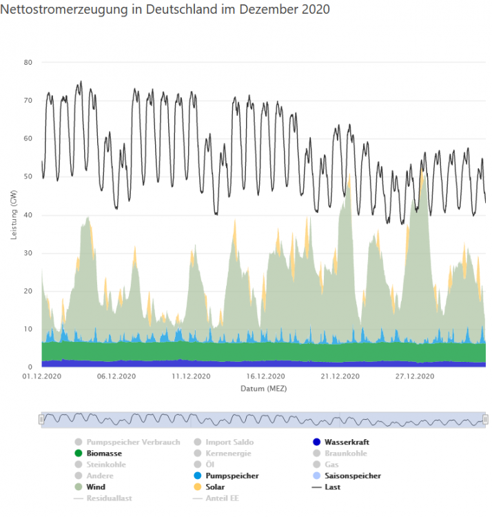 fancY Januar 7, 2021 vor 1 Stunde von Bratapfel: Und bitte nicht mit Solar oder Wind kommen, dazu gibt es genügend Info, das es nicht klappt. Wir haben hier seit Wochen Hochnebel ohne jegliche Windböe geschweige denn Solar Windböen in Baden-Württemberg beeinflussen die Windstromerzeugung Deutschlandweit nicht so stark wie du vielleicht annimmst. Die letzten Wochen wurde schon Strom aus Wind erzeugt: Diesen Beitrag teilen Link zum Beitrag