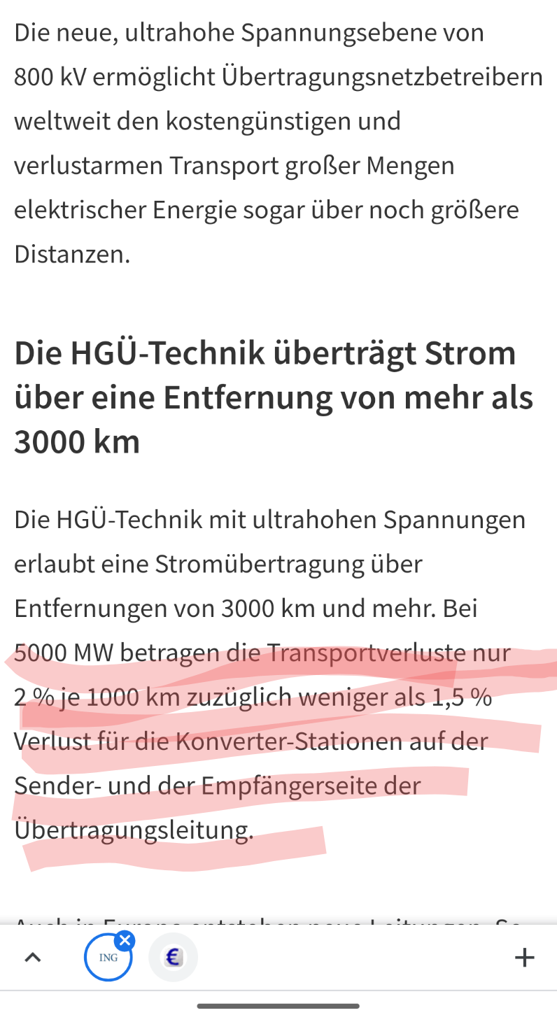 reko März 20, 2021 · bearbeitet März 20, 2021 von reko vor 7 Stunden von Halicho: Bei ausreichend hoher Spannung sind die Verluste auch kein Problem. Man kann auch Gigavolt-HGÜ-Leitungen mit 12GW Leistung bauen. Siehe China, das in fernerer Zeit ein Weltverbundnetz anstrebt. Die HGÜs in Europa haben maximal 380 kV. Darüber kommt man an physikalische Grenzen. Die Kosten und die Risiken steigen überproportional. Auch wenn in China das Maximum bei 1100kV ausgereizt wird, ist das nur die 3 fache Leistung und ich möchte bei Regen und Gewitter nicht in der Nähe sein. Die Sicherheitsabstände sind vermutlich im Kilometerbereich. In China werden maximal 12 GW übertragen. Bei Nordstream muß man eine zweite 60GW Gasleitung parallel verlegen. Wollen wir das durch Stromleitungen übertragen, brauchen wir 10 chinesische 1100kV HGÜ Trassen parallel. Diesen Beitrag teilen Link zum Beitrag