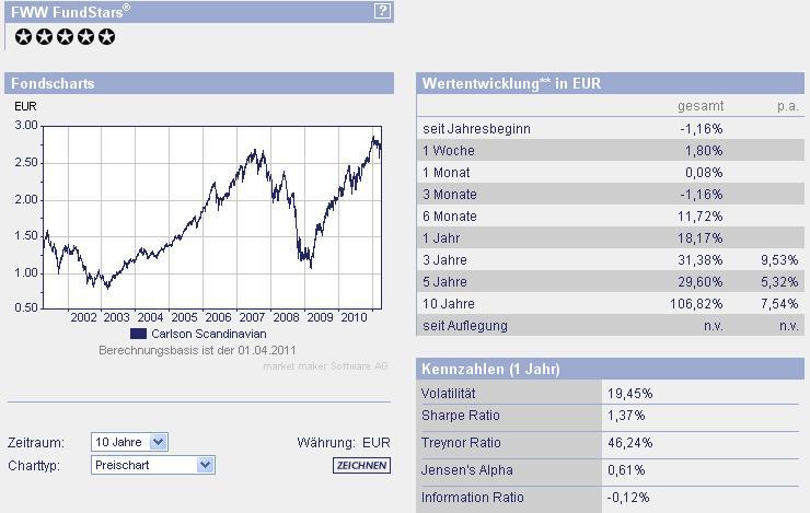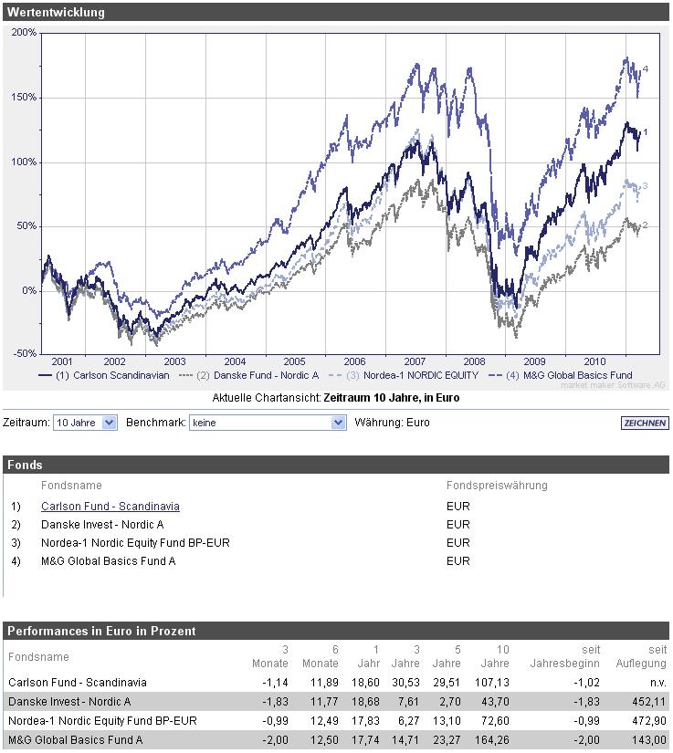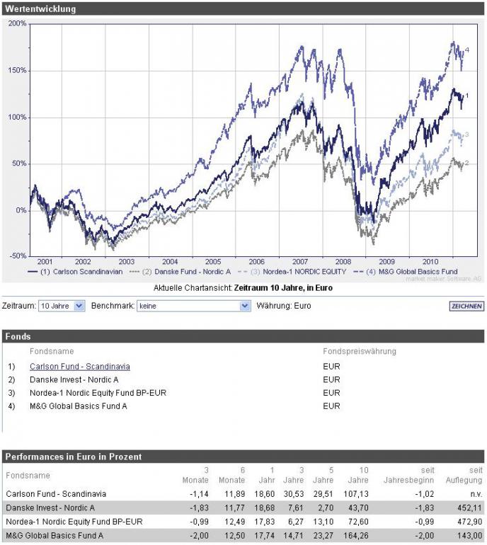 ghost_69 April 4, 2011 · bearbeitet April 4, 2011 von ghost_69 Carlson Fund - Scandinavia Fondsporträt Dieser Fonds investiert in Aktien in Schweden, Finnland, Dänemark und Norwegen. Basisdaten WKN / ISIN: 987767 / LU0083425479 Fondsgesellschaft Carlson Fund Management Company S.A. https://www.carlsonfunds.com/global/disclaimer Fondsmanager Herr Karl Hogtun, Herr Kjell M. Hjornevik Anlageregion Skandinavien Anlageschwerpunkt Aktienfonds All Cap Benchmark VINX Capped SEK Index Net Risikoklasse 4 Fondsvolumen 93,90 Mio. EUR Auflegungsdatum 07.01.1998 Ertragsverwendung thesaurierend Geschäftsjahr 1.1. - 31.12. Garantie Nein Laufzeit unbegrenzt Kauf / Verkauf Ja / Ja VL-fähig Nein Kosten Ausgabeaufschlag (effektiv) 5,00% (4,76%) Depotbankgebühr p.a. 0,00% Managementgebühr p.a. 1,25% Gesamtkostenquote (TER) 2009 1,33% Carlson Fund - Scandinavia.pdf Hier ein Vergleich: Drei Skandinavien Fonds gegen MG, ich vergleiche oft mit dem MG dann weiß ich wo ich liege mit einem anderen Fonds. Ja ich weiß Skandinavien gegen den Rest der Welt. Fachsheet von der Gesellschaft: carescilx_news_de.pdf http://de.wikipedia.org/wiki/Schweden http://de.wikipedia.org/wiki/Norwegen http://de.wikipedia.org/wiki/Finnland http://de.wikipedia.org/wiki/D%C3%A4nemark Außer Finnland haben die anderen 3 keinen Euro und wenn die Staaten schlau sind bleiben die auch der Eurozone fern, alleine deswegen werden diese Länder nach meiner Meinung besser abschneiden auf längere Sicht als die Eurozone, dazu haben gewisse Gebiete Rohstoffe was auch zum Wachstum dieser Länder beitragen wird. Bei mir weiterhin auf der Watchlist. Ghost_69 :- Diesen Beitrag teilen Link zum Beitrag
