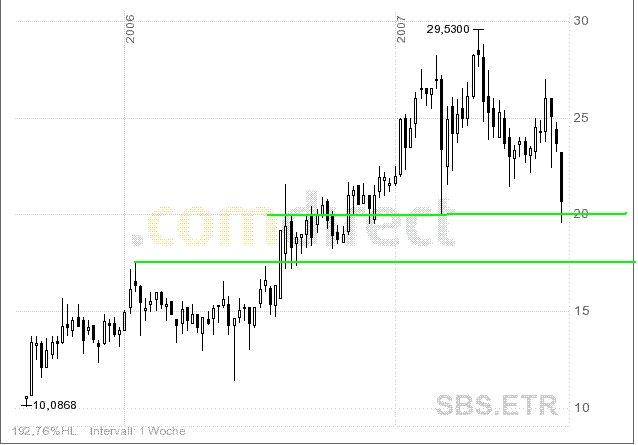 Mitch August 14, 2007 Langfristchart hatte Toni im Beitrag #608 dargestellt. Der langjährige Aufwärtstrend wurde seitdem gebrochen. Eine Unterstützung gibt es so um die 20,00 ; danach 17,50 . Am 10.08.07 hat sich ja auch ein schöner Hammer ins Chartbild eingefügt, der vielleicht schon den Wendepunkt markiert. Treffen die Einschätzungen aus Deiner eigenen Fundamentalanalyse und Deinen EPS-Schätzungen ein (nachdem ich hier nachträglich alle Deine Beiträge gelesen habe, zweifle ich nicht daran), so wird sich ein neuer Aufwärtstrend etablieren. Würde ich hier längerfristig einsteigen wollen, würde ich nun um 20,00 die eine Hälfte kaufen und schauen, ob ich weiter unten nachkaufen kann bzw. würde die Position beim Überschreiten der 200er Tageslinie komplettieren. Diesen Beitrag teilen Link zum Beitrag