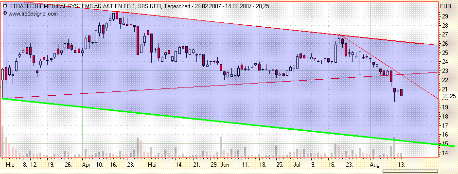Mitch August 14, 2007 Bei einer Shortstrategie kann man neben den oben errechneten Kursziel aber auch eine parallele Trendlinie (grüne Linie) ziehen und die Position bei erreichen dieser Begrenzungslinie glattstellen. Diesen Beitrag teilen Link zum Beitrag