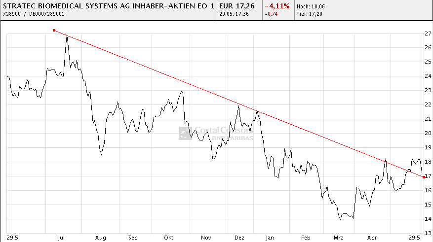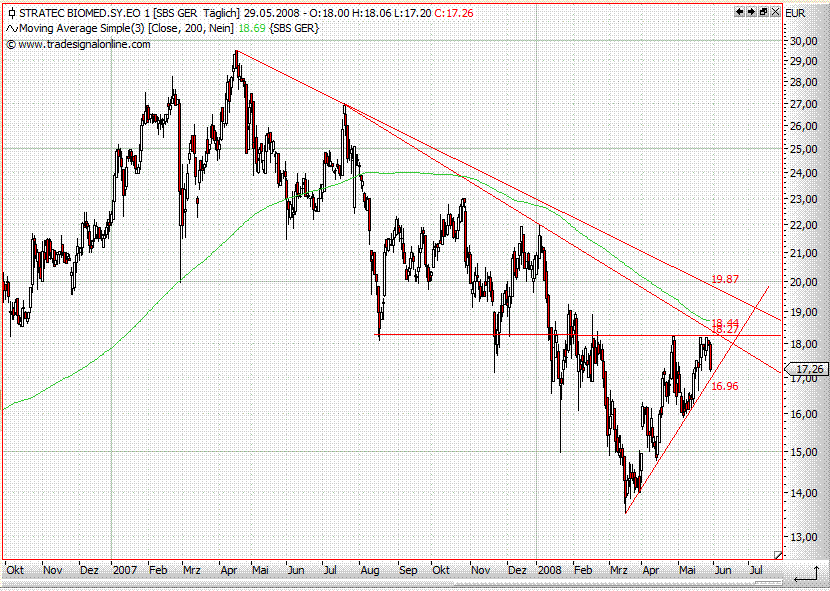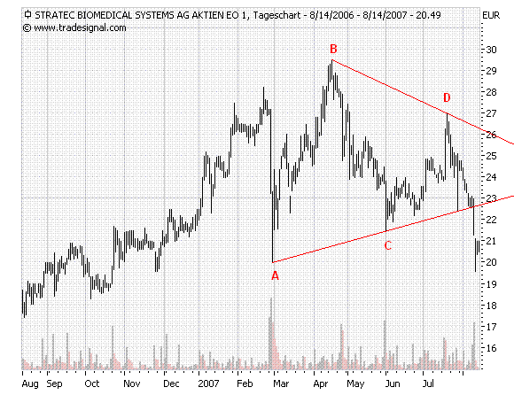 Caruso1 Juni 21, 2008 Hallo zusammen! Nu denn, wie sieht es charttechnisch um Stratec aus. In dem Chart habe ich ein bearishes symmetrisches Dreieck eingezeichnet. Kursdifferenz A (19,97 ) nach B (29,53 ) = 9,56 . Ausbruchsniveau ca. 22,60 - 9,56 = 13,04 Kursziel. Hallo Mitch, dein Kursziel wurde am Freitag mit 13,10 fast erreicht. 13,87 ohne fundamentale Änderungen.. dann kauf ich auch. Bist Du jetzt dabei? Diesen Beitrag teilen Link zum Beitrag