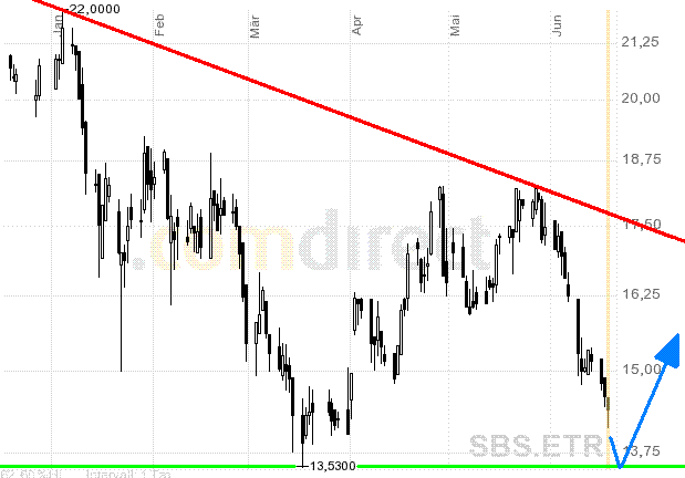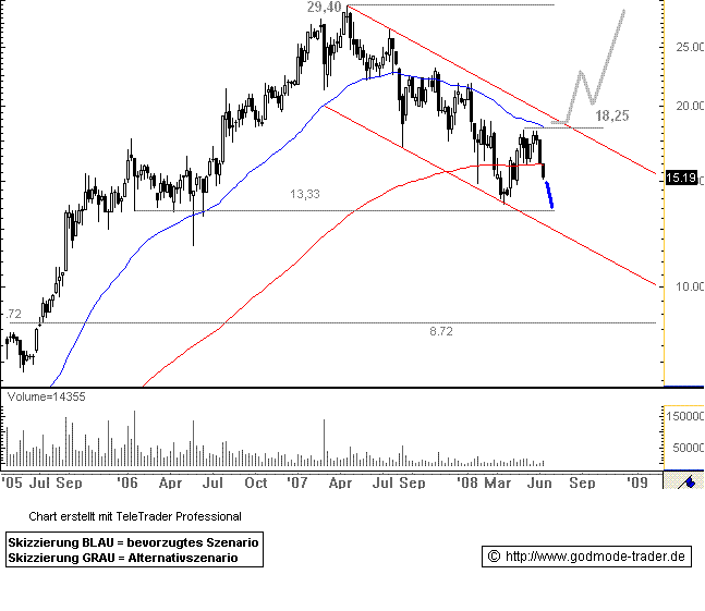 Toni Juni 18, 2008 TA-Update: In den nächsten Tagen wird es wieder interessant: Kann das Tief bei 13,5 Euro (grün) verteidigt werden und damit evtl. ein Doppelboden gebildet werden? Wünschenswert wäre der in blau eingezeichnete Kursverlauf, um dann endlich den Abwärtstrend (rot) angreifen zu können. Diesen Beitrag teilen Link zum Beitrag