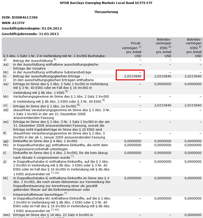 Calci Mai 22, 2014 1. Ich verstehe es so, dass die zu versteuernden Thesaurierungen zum Geschäftsjahresende auftreten. Dies ist im Falle von ishares der 28.2.13. Da ich meinen Sparplan erst im Juni begonnen habe sind keine ausschüttungsgleichen Erträge angefallen und ich muss für 2013 keine in der Anlage KAP angeben. Ist das soweit richtig? D.h. konkret: Ich mache meine Steuererklärung für 2013 und gebe an, was laut Veröffentlichung im Bundesanzeiger an ausschüttungsgleichen Erträgen angefallen ist. Für meinen ETF110 (LU0392494562) ist das Datum der letzten Veröffentlichung im Bundesanzeiger der 9.10.2013 für den Zeitraum vom 1. Juli 2012 bis 31. Juni 2013. Der dort veröffentlichte Wert (0€) wäre in der Steuererklärung anzugeben, obwohl ich keine Daten habe, ob nicht bis zum 31.12.2013 noch ausschüttungsgleiche Erträge angefallen sind? Diesen Beitrag teilen Link zum Beitrag