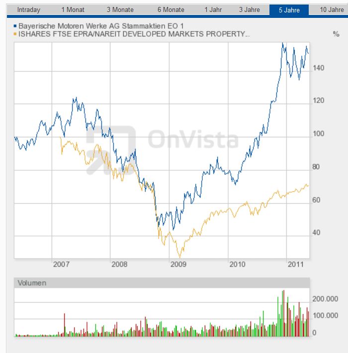 Ragnarök Mai 15, 2011 Jetzt wäre doch mal Platz für eine Diskussion. Das ist ja schließlich keine Plattform hier zum Pushen von Produkten, sondern man kann hier auch Ideen diskutieren. Man sieht sondern, das 30 deutsche Aktien, dieselben synchronen Schwingungen machen wie die der Wirtschaft von der gesamten westlichen Welt. Da sieht man was Globalisierung bedeutet. Z1 Natürlich. Die Korrelation zwischen MSCI World und DAX ist >0.9, das beta >1, da im DAX viele EM-Risiken stecken. Das tut aber alles nichts zur Sache. Denn bei deiner Diskussion muss man zwei Dinge unterscheiden: 1. Wie vernünftig ist es, den DAX (nichts anderes erhältst du, wenn du 20 zufällige Titel aus dem DAX auswählst) mit dem MSCI World zu vergleich: Es ist eine reine Länderwette auf eine exportorientierte Nation. Du hast viel weniger Diversifikation, als wenn du in den MSCI World investierst. -> ergo Vergleich Sinnlos. Und außerdem möchte ich ja keinen Index abbilden. Da ist das 3-malige Wiederanlegen pro Jahr nicht so schwer. z2 2. Wie vernünfig ist deine Strategie? Eine Zufallsmenge von 20 Titeln aus sagen wir 100 ist aber schon ziemlich nahe an einem Index dran. Dein aktiver Ansatz umfasst ja keine Fundamentalanalyse oder dergleichen, deswegen kannst du schon fast von einem Indexähnlichen Produkt sprechen, mit hoher Korrelation zu einem Marktkapitalisierungsgewichteten Produkt. Einziger Unterschied: Dein Risiko ist höher als der im DAX: im DAX große Firmen stärker vertreten als Kleine. Eine gleichgewichtete Zufallsauswahl wird mit gleicher WS große wie kleine Firmen auswählen, weshalb du eine Risikomischung aus SDAX, MDAX und DAX bekommst -> mehr Risiko, wohl auch mehr Rendite (beta > 1 gegenüber DAX). Und nocheinmal: Mit dem Weltdepot zahlst du pro Jahr einen Aufschlag von ca. 1,45 %. Diesen Aufschlag hat das zufällige 30-Werte-Depot nicht. Daraus schließe ich, dass das Depot mit den Einzelaktien unter der Berücksichtigung des unterschiedlichen Risikos (Hebel) jedes Jahr eine bessere Performance von ca. 1,4 % hat. z3 Wenn du es wiederholst, wird es nicht richtiger. Du stützt deine Behauptung einzig und alleine auf Aduns Beitrag. Sonst hast du hier nix kritisch hinterfragt. Es ist doch ganz einfach: Wie groß ist der Tracking Error eines beliebigen Indexprodukts gegenüber seinem Index? Und hier kann man nachschauen: DBX1MW: 0.32% p.a., das ist sogar niedriger als seine TER. Also nix von wegen 1.5%... Natürlich könnte man nun noch über die Swaprisiken sprechen, die nicht vergütet sind (och, sind sie doch: niedrigerer Tracking error.) Anders Beispiel: vollreplizierender ishares DAX: tracking error 0.05% p.a., bei einer TER von 0.17%. Was sagst du nun? Deine TA Kosten dürften bei 20 Aktien inkl. Wiederanlage der Dividenden deutlich über dem niedrigen Tracking Error des DAX ETFs liegen: Angenommen: 20 Aktien, 15 schütten aus, 3% Dividendenrendite, mit frischen Kapital + Dividenden rebalancen: 15 TA pro Jahr, bei Flatex 15 * 5.9 (+0.5% Spread) von 100000 Anlagekapital: 90 TA Kosten direkt + Spread 15 -> 0.1% p.a. TER (+ Opportunitätskosten deine Arbeitszeit). Bei 100000 zahlst du hier eine höhere TER als wenn du direkt in den DAX ETF investierst. Bei 1000000 schaut das ganze wieder anders aus. Da kann man schon direkt über genügend Aktien Diversifizieren. (Dein Beispiel war ja 60000 -> 0.17% Tracking Error + Arbeitszeit) Was mir zusätzlich an deutschen Aktien gut gefällt ist: Der Finanzsektor hat nur einen Anteil von ca. 8 % an den Dax-100 Werten. In vielen anderen Ländern liegt die Quote bei unangenehmen 20 %. Das ist deine persönliche aktive Strategie. Also doch kein zufälliges Auswählen mehr? Zur Not kannst du bei 100000 ja zu 95000 in den MSCI World und zu 5000 Short Eurostoxx Banks gehen. Dann minimierst du auch dein Bankenexposure. Z1 Ich bestreite ja nicht, dass man einen mathematischen Vorteil von einem MSCi WORLD Fond hast, wie z.B eine bessere Diversifikation hast. Ich sage nur, dass davon nach Abzug der Kosten nichts mehr übrig bleibt. Ich gehe übrigends von 30 Einzelwerten aus. Denn da hat man durch weiteres hinzuführen von Aktien kaum noch einen Vorteil. http://en.wikipedia....n_%28finance%29 Ich habe mir verschiedene Anlageklassen angesehen zum DAX. Während der Krise 08 sind alle Anlageklassen im Gleichschritt mit den Dax in den Keller gegangen. Und warum soll ich für einen Gleichschritt in schlechten Zeiten diesen Kostenaufschlag zahlen (ca. 1,4 %). Ich sehe keinen Sinn darin ein kleineres Stück vom Weltkuchen zu haben, wenn das Stück teuer ist und sich im Krisenfall wie der Dax verhält. Das ist nur Größe ohne nutzen. Ein Vergleich macht immer sinn. Bei jeder wirtschaftlichen Überlegung ist zu schauen, das Beezahle ich und was bekomme ich dafür. Ich sehe den World Fond eher als eine art Versicherung an, für die ich ca. 1,4 % mehr zahle. Außerdem verstehe ich nicht, warum DAX Werte ein EM Risiko haben soll aber der World Fond nicht. Das ist doch nicht richtig. Ich habe noch ein Paar andere Bilder drangehangen. Alle Bilder zeigen einen Gleichschritt in der Krise. z2 30 Werte bitte! Gebe ich zu, da hast du recht. Aber beta > 1 ist ja nicht an sich schlecht oder gut. Wenn es gut läuft mit der Wirtschaft, gehen die Kurse stärker nach oben, wenn sie sich abkühlt gegen sie schneller nach unten. Wie gesagt, ist ein Hebel. Das ist wertneutral. z3 Die Überlegungen von Adun habe ich schon hinterfragt und sie für grundsätzlich richtiggehalten. Strittig ist der Wert des Risikozuschlags. Das das Risiko da ist, ist ein Axiom der Wirtschaftswissenschaft: Nur mit Risiko kann man Geld vermehren! Und da ich das Risiko nicht kenne, schlage ich auf jedenfall eine Prämie drauf von 1%). Auch wenn man die ganze Zeit es leugnet, eine Risiko ist es, mit Swaps zu arbeiten und den Bestand zu verleihen. Deine Überlegung der Überprüfung ist falsch. Erst wenn der Schaden passiert, wird eingepreist. Du kannst den Spread nicht nehmen. Bei 60000 und 2,5 Prozent durchschnit