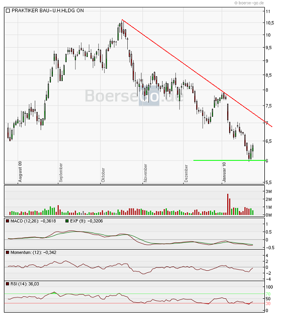 insanetrader Januar 27, 2010 Wer den Kick braucht, kann ihn hier finden. Könnte ein kurzfristiger Rebound werden, zumindest bis knapp über 7, denn da wartet der mittelfristige Abwärtstrend. RSI und Momentum steigend, MACD könnte nach oben drehen. Sehe das aber nicht als absteigendes Dreieck, sondern als Unterstützung, die noch aus dem letzten Mai/Juni herrührt. Aktie hatt immerhin gut 40% in kurzer Zeit verloren....Danach muß man sehen, ob der Abwärttrend gebrochen wird. Immerhin hatte Praktiker bis zum Peak innerhalb eines halben Jahres um über 200% zugelegt - von 2.80 auf über 10. Beide Werte waren wohl Übertreibungen. Der aktuelle Kurs liegt schon eher im Rahmen einer angemessenen Bewertung. Natürlich kann man trotzdem auf eine kurzfristige Erholung setzen. Diesen Beitrag teilen Link zum Beitrag