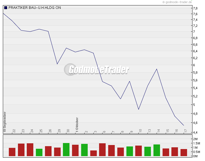fw1962 Oktober 18, 2008 · bearbeitet Oktober 18, 2008 von fw1962 Kurs = 4,54 - echt verrückt - vermutlich gilt die 20 % Rabatt Praktiker Werbung auch für die eigene Aktie Diesen Beitrag teilen Link zum Beitrag