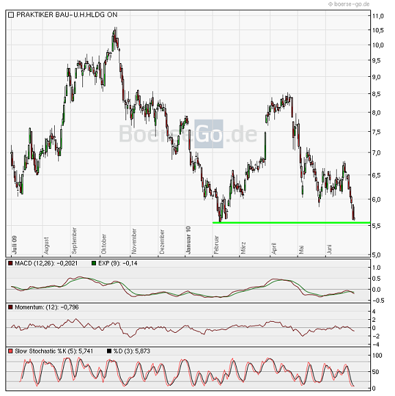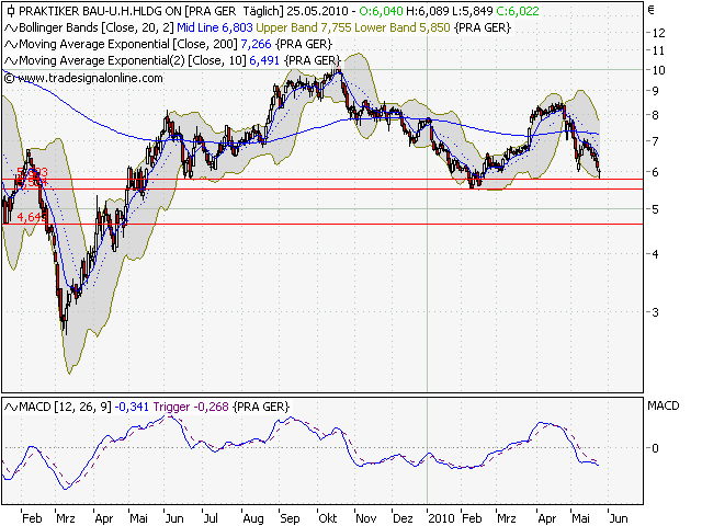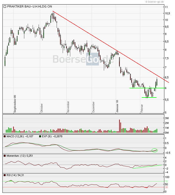 markymark Februar 20, 2010 Wie erwartet, hat die Praktiker erstmal halt gemacht und zum Rebound angesetzt. Ging zwar noch ein bisschen tiefer, allerdings wurde die 6 Marke schnell zurückerobert. Jetzt steht allerdings der mittelfristige Abwärtstrend vor der Tür. Die indikatoren sind allerdings auf jetztigem Niveau noch nicht stark genug, jedoch hat die Aktie gute Chancen, den Trend in den nächsten Tagen zu knacken. Man muß sich vor Augen halten, daß der Wert in kurzer Zeit gut 50% eingebüßt hat. Diesen Beitrag teilen Link zum Beitrag
