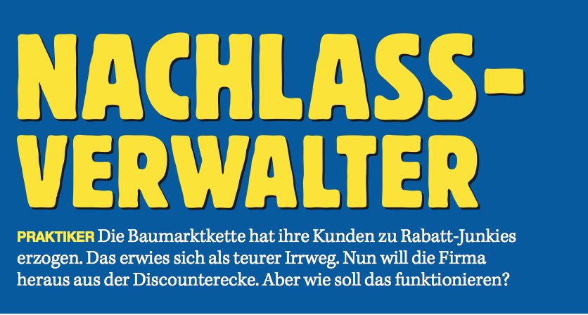 Chris89 Februar 17, 2011 In der Februar-Ausgabe vom ManagerMagazin ist übrigens ein Artikel Praktiker gewidmet. Lesenswert! Diesen Beitrag teilen Link zum Beitrag