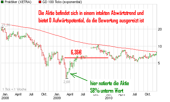 Nimbus Februar 17, 2011 Nachdem Praktiker momentan alles dafür tut, seine Marge zu verbessern, ist der Kurs heute intraday bis auf c.a. 8,80 Euro geklettert. Vorher hat sich der Kurs eigentlich jeden Tag maximal um 0,05 bewegt. Wenn ihr mich fragt, ist das ein klassischer Ausbruch nach oben. Bei einem KBV von weit, weit unter 1 besteht locker Potential bis c.a. 15 (dann wären wir bei etwa KBV 1). Bekanntlicherweise sind die Konsumenten ja zur Zeit mit Geld gesegnet, ich persönlich spekuliere darauf, dass bei einigermaßen gutem Wetter die Zahlen im späten Frühjahr sehr gut sein werden (im Vergleich zum Vorjahr). Dann wird bestimmt noch etwas Fantasie in den Kurs kommen, so dass ich mir gute Chancen ausrechne, dass Praktiker wieder mal die 20 Euro sieht, vielleicht sogar 30. Und zwar in diesem Jahr. Diesen Beitrag teilen Link zum Beitrag