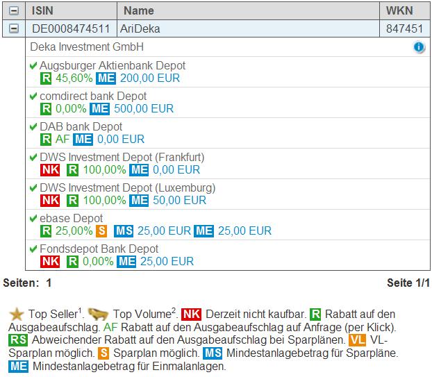 Padua Mai 25, 2011 Die meisten Fonds geben einen AA an, z.B. 5%. Es gibt auch Fonds, die einen AA von 0% haben, die haben dann aber meistens höhere laufende Kosten. Ob und wieviel AA man dann tatsächlich zahlt, hängt im wesentlichen dann davon ab, wo man sein Depot hat und wie das Angebot dort ist. Die meisten Online-Broker geben z.B. mehr oder weniger große Rabatte, so dass man oft auch gar keinen AA zahlen muss. Aber man kriegt dort natürlich nicht immer jeden Fonds ... z.B. DEKA gibt es außerhalb der Sparkassen gar nicht, soviel ich weiß .... was aber auch kein großer Verlust ist. Man kann viele Fonds natürlich auch direkt an der Börse kaufen .... da fällt auch kein AA an, nur die An- und Verkaufskosten. Besonders interessant für kostenbewußte Anleger sind hier natürlich ETFs. Die DEKA-Fonds bekommt man über Fondsvermittler schon rabattiert, teilweise sogar zu 100 % (siehe Anlage AVL-Vermittler). Über den Fonds-Supermarkt scheint das allerdings nicht zu gehen. Aber ich bin ich der Meinung - DEKA muss es wahlich nicht sein. Es gibt genügend bessere. Gruß Padua Diesen Beitrag teilen Link zum Beitrag