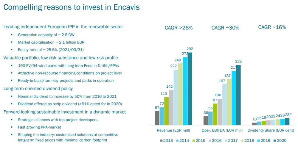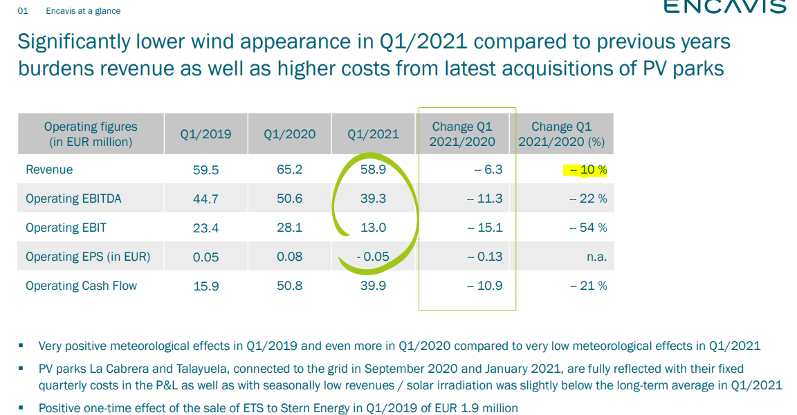 Ich kann Interessierten nur die IR Seite von Encavis empfehlen - iB auch das Factbook dort. Heute kamen die Zahlen die nicht makellos waren (YOY Revenues -10%, YOY OCF -21%). Aber sehr viel Negatives ist im Kurs eingepreist, wir kommen immerhin von fast 25€ Anfang Februar und notieren jetzt seit einigen Tagen wieder um/unter 15€. Die Aktie hat stark unter auf dem allgemeinen renewable hype profitiert, aber in den letzten Wochen wurde sehr viel heiße Luft abgelassen. Ich habe beim Abverkauf in letzten Wochen immer mal wieder kleinere Positionen gekauft und Stand jetzt ca 3% meines Portfolios in Encavis investiert. Von "billig" kann auch bei derzeitigen Preisen noch nicht die Rede sein. Allerdings hat man eine vernünftige guidance (die heute nochmal bestätigt wurde, die Kapazitäten wurden zu Q1/2020 um 40% gesteigert und das Minus geht wohl größtenteils von Einmaleffekten aus - schlechtes Wetter zähle ich allerdings nicht als Einmaleffekt, hier wird es immer Schwankungen geben). Hier der Auszug aus dem Factbook mit den Zahlen zu Q1/2021: